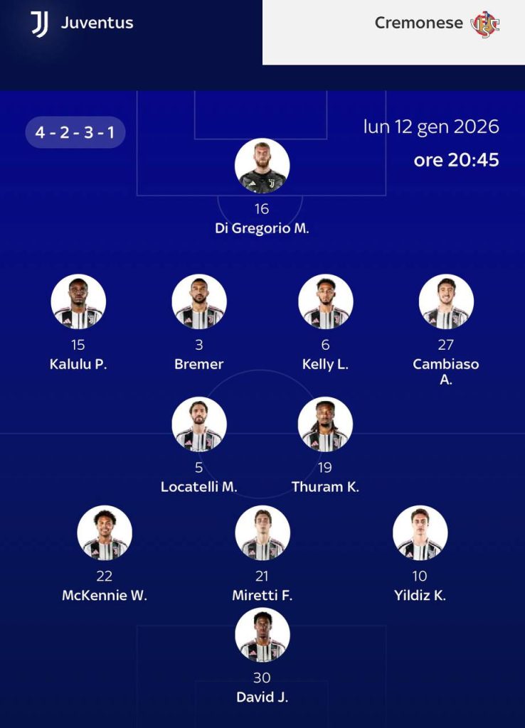 Sky Sport-მა კრემონეზესთან მატჩში იუვენტუსის სავარაუდო სასტარტო შემადგენლობა გამოაქვეყნა.