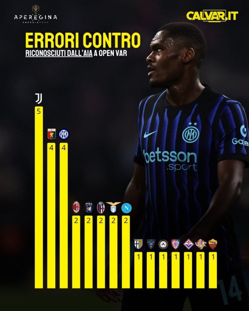 გამოცემა CalVAR-მა სერია ა-ს იმ გუნდების სია გამოაქვეყნა, რომელთა მიმართებაში მიმდინარე სეზონში მსაჯები ყველაზე ხშირად ცდებიან.