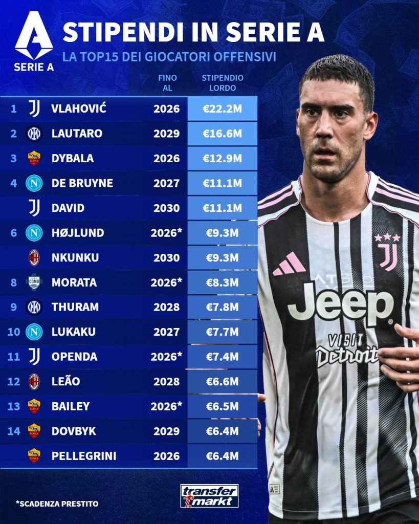 პირველ ადგილს იუვენტუსის ფორვარდი დუშან ვლაჰოვიჩი იკავებს, მისი წლიური გასამრჯელო ტურინულ გრანდს TAX-ების ჩათვლით 22.3 მილიონი ევრო უჯდება, ათეულში მოხვდნენ ჯონათან დევიდი და ლოის ოპენდაც: